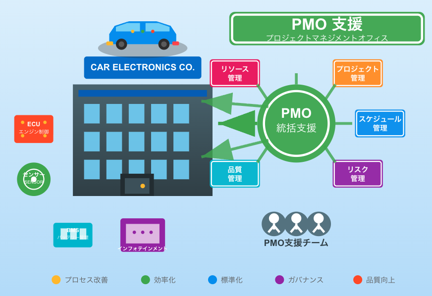 国際的に定められたマネジメント知識体系を熟知し、高いレベルのコミュニケーション/ドキュメンテーション能力や調整能力を保有している人材(プロジェクトマネジメントの専門家)がお客様のプロジェクト業務をサポートすることにより、プロジェクトに対して「スピーディで正確な意思決定」をもたらすことができます。