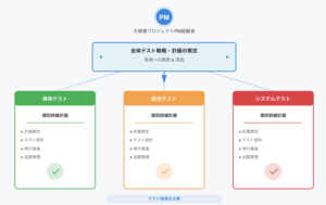 大規模プロジェクトPM経験者の知見に基づき全体テスト戦略、全体テスト計画の策定および現場への展開&浸透を行うとともに、単体テスト、結合テスト、システムテストにおける個別詳細計画への落とし込み+テスト推進を主導。