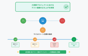 大規模プロジェクトにおけるテスト組織の立ち上げを実現し、成功裡に各テスト工程のマイルストーン目標の達成に貢献。