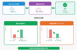 新プロセスを現場に根付かせることができたとともに、開発者の意識改革にも成功し、結果として製品の品質が上がり、大幅な開発コストダウンを達成した。