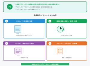 大規模プロジェクトPM経験者の知見+弊社が保有する知的資産に基づき、プロジェクトマネジメント計画策定支援、運営計画策定支援、レビューチェックリストの整備を行った。