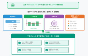 主要プロジェクトにおいて週次でタイムリーに各チームの進捗状況、コスト状況、品質状況、課題・リスク対応状況について適切に吸い上げることができるようになり、マネジメント側で適切に「次の一手」を検討することができるようになった。