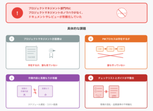 プロジェクトマネジメント部門内にプロジェクトマネジメントのノウハウがなく、ドキュメントやレビューが形骸化していた。